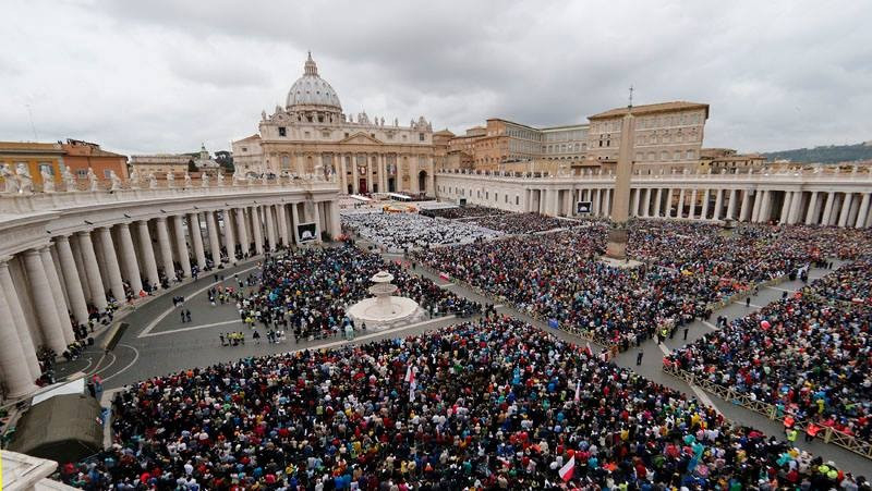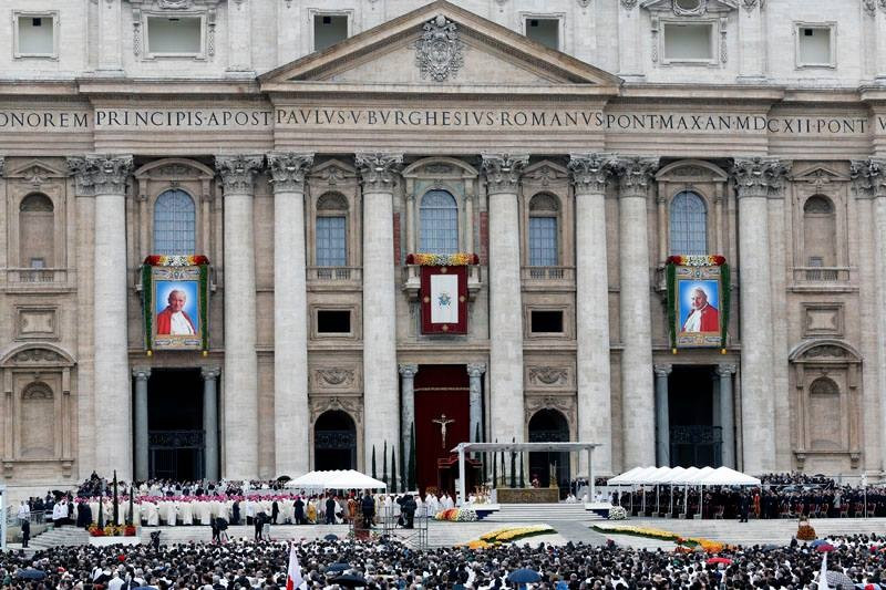 A Via della Conciliazione már éjszaka tele volt zarándokokkal, akik hálózsákban aludva várták a hajnalt, amikor megnyitották a térhez vezető utakat. Az éjszakát a hívek nagy része a nyitott templomokban töltötte imával, az Oltáriszentség imádásával, gyónással, rózsafüzér-imával. Természetesen a sok-sok nemzetiség közül számban a legtöbben Lengyelországból és Bergamo környékéről, a két új szent, II. János Pál és XXIII. János földjéről érkeztek, de a világ minden részének zászlója lengedezik az Örök Város szívében, a Szent Péter-bazilika környékén. (...)