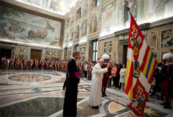 A gárdisták által viselt egyenruha száz éves. Színeit az egész világon jól ismerik. Azonban minden egyenruha mögött egy valós személy áll, a maga családjával, származási helyével, személyiségével, vágyaival és terveivel. A svájci gárdisták nem egyenruhájukkal, hanem kedvességükkel, befogadó, szeretetteli viselkedésükkel tesznek jó benyomást az emberekre. Ez jellemezze a gárdisták egymás közti kapcsolatait is: a nehézségekben álljanak társaik mellé – buzdította őket a Szentatya, majd háláját fejezte ki szolgálatukért.